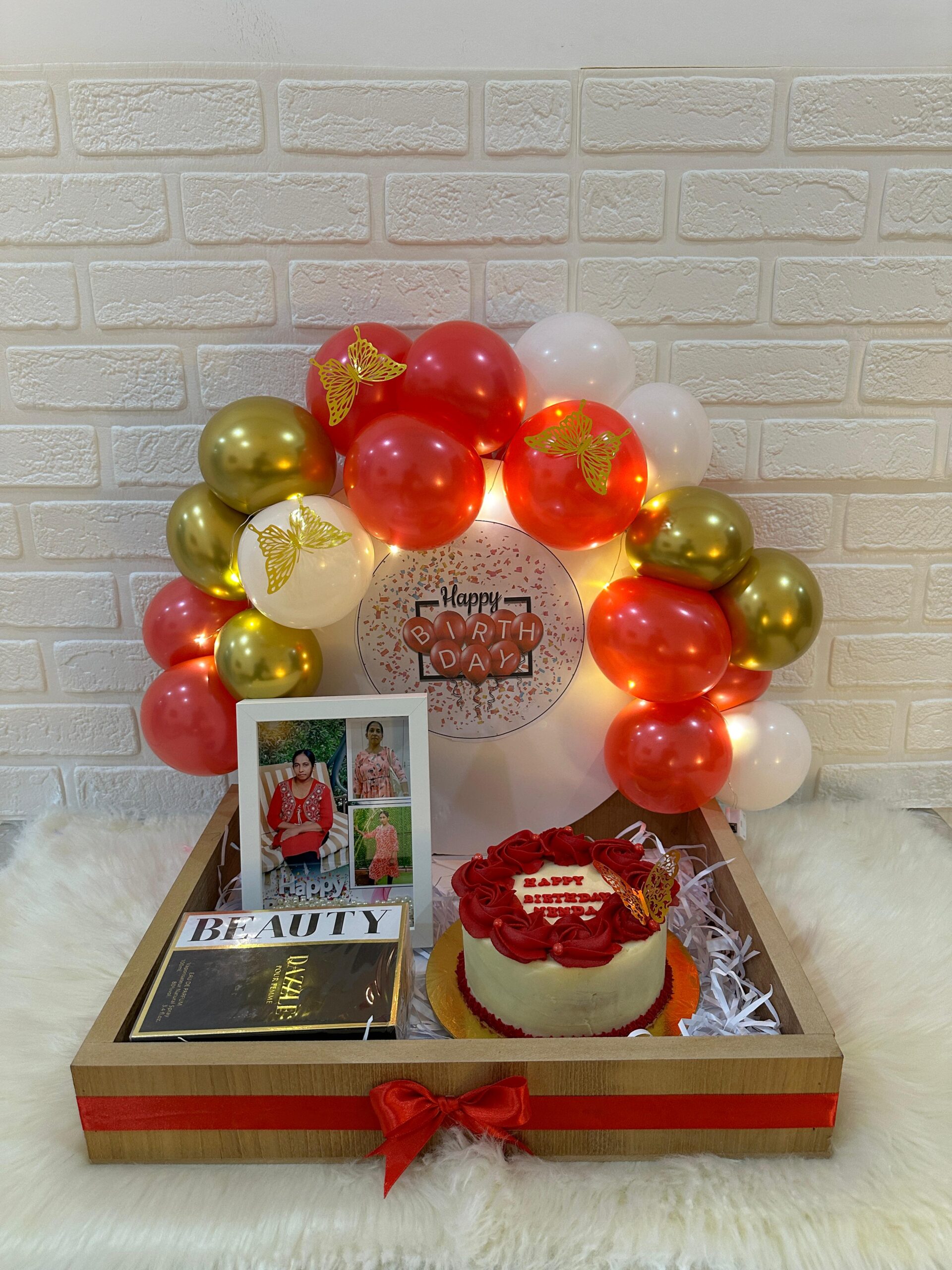 A beautifully arranged balloon hamper designed to make any occasion truly special. Complete with decorative lights, a photo frame, a customized cake, perfume, and elegant details, this package is the perfect gift to surprise your loved ones.