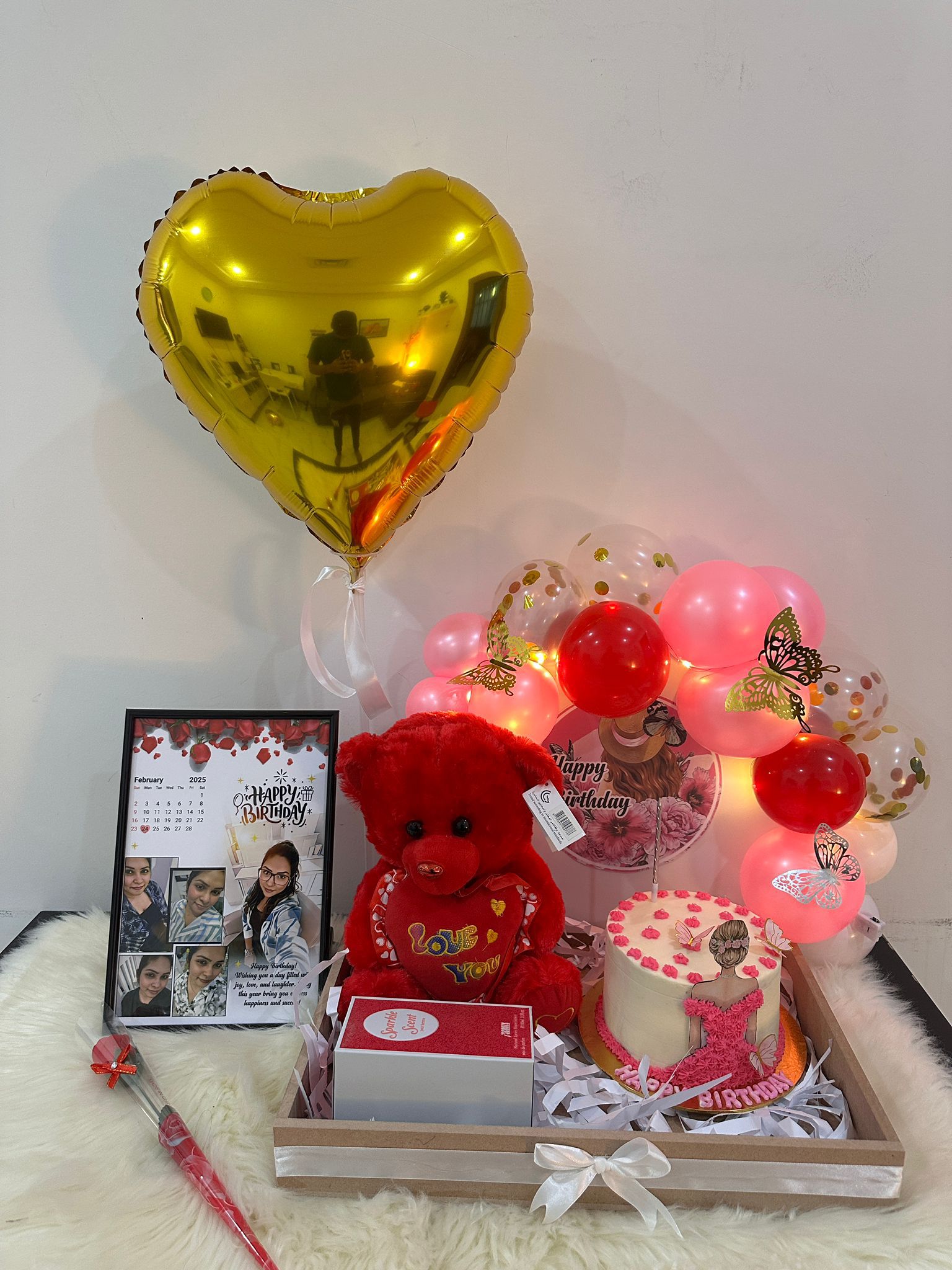 A beautifully arranged balloon hamper featuring premium balloons, soft decorative lights, a wooden tray, a photo frame, a customized 1 kg butter icing cake, an artificial red rose, a cute teddy, and perfume. Perfect for gifting on birthdays, anniversaries, or any special celebration.