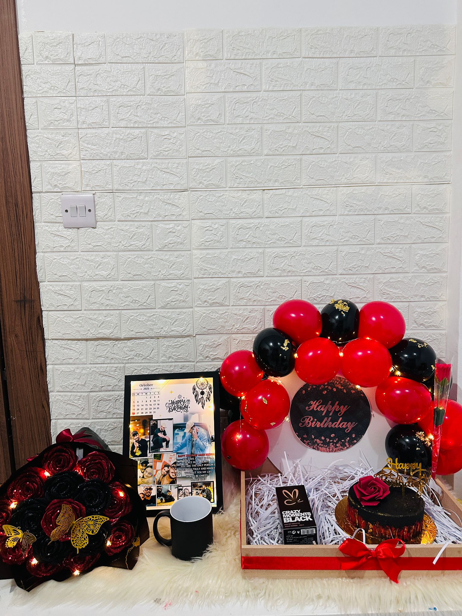 A beautifully arranged balloon hamper featuring premium balloons, soft decorative lights, a wooden tray, an A4 light-up photo frame, a 500g customized butter icing cake, perfume, a printed magic mug, and a ribbon flower bouquet with 15 flowers. Perfect for gifting on birthdays, anniversaries, or any special celebration.