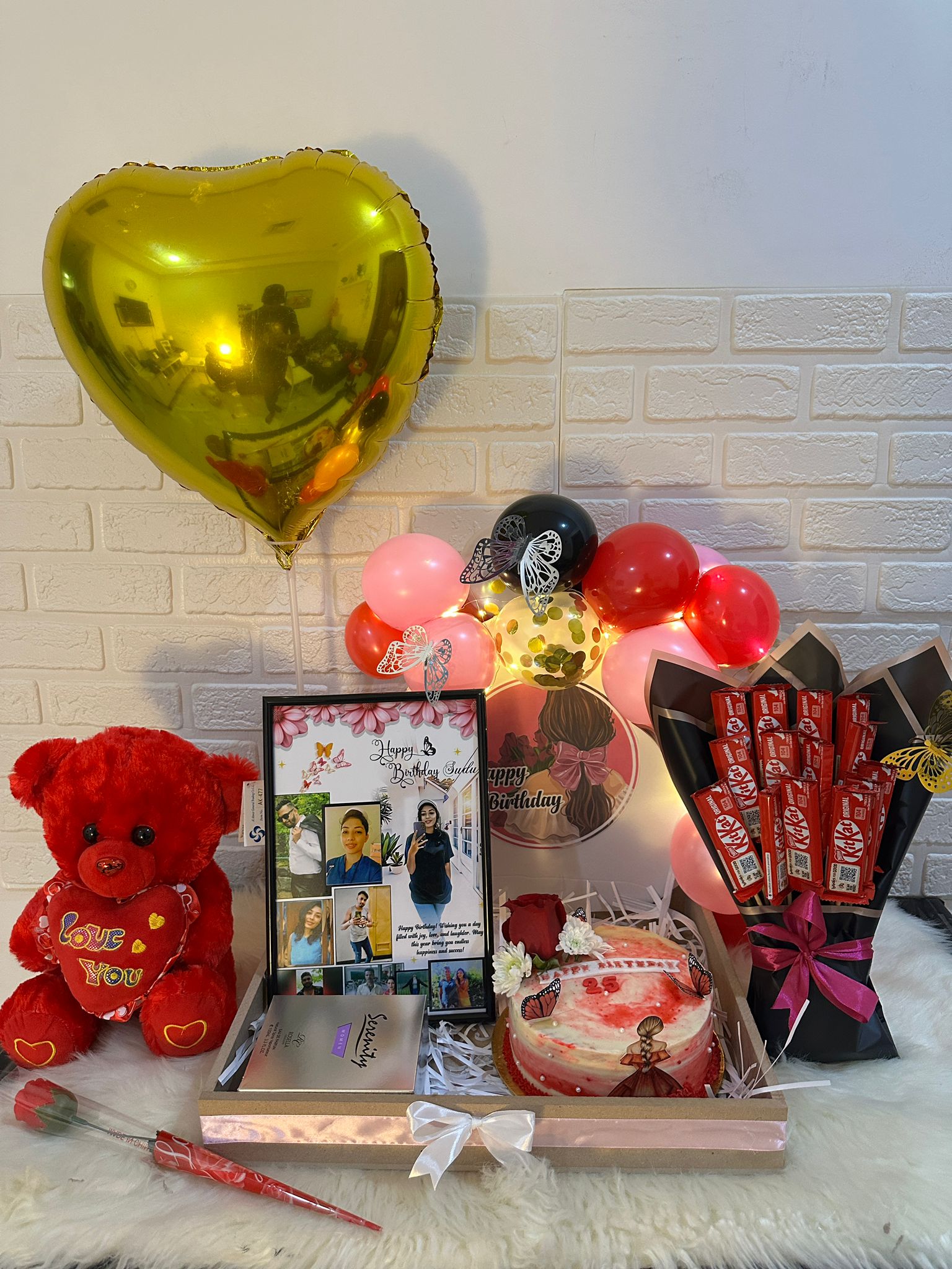 A beautifully arranged balloon hamper featuring premium balloons, soft decorative lights, a wooden tray, a cute teddy, an A4 photo frame, a customized 1 kg butter icing cake, perfume, a chocolate bouquet, and an artificial red rose. Perfect for gifting on birthdays, anniversaries, or any special celebration.