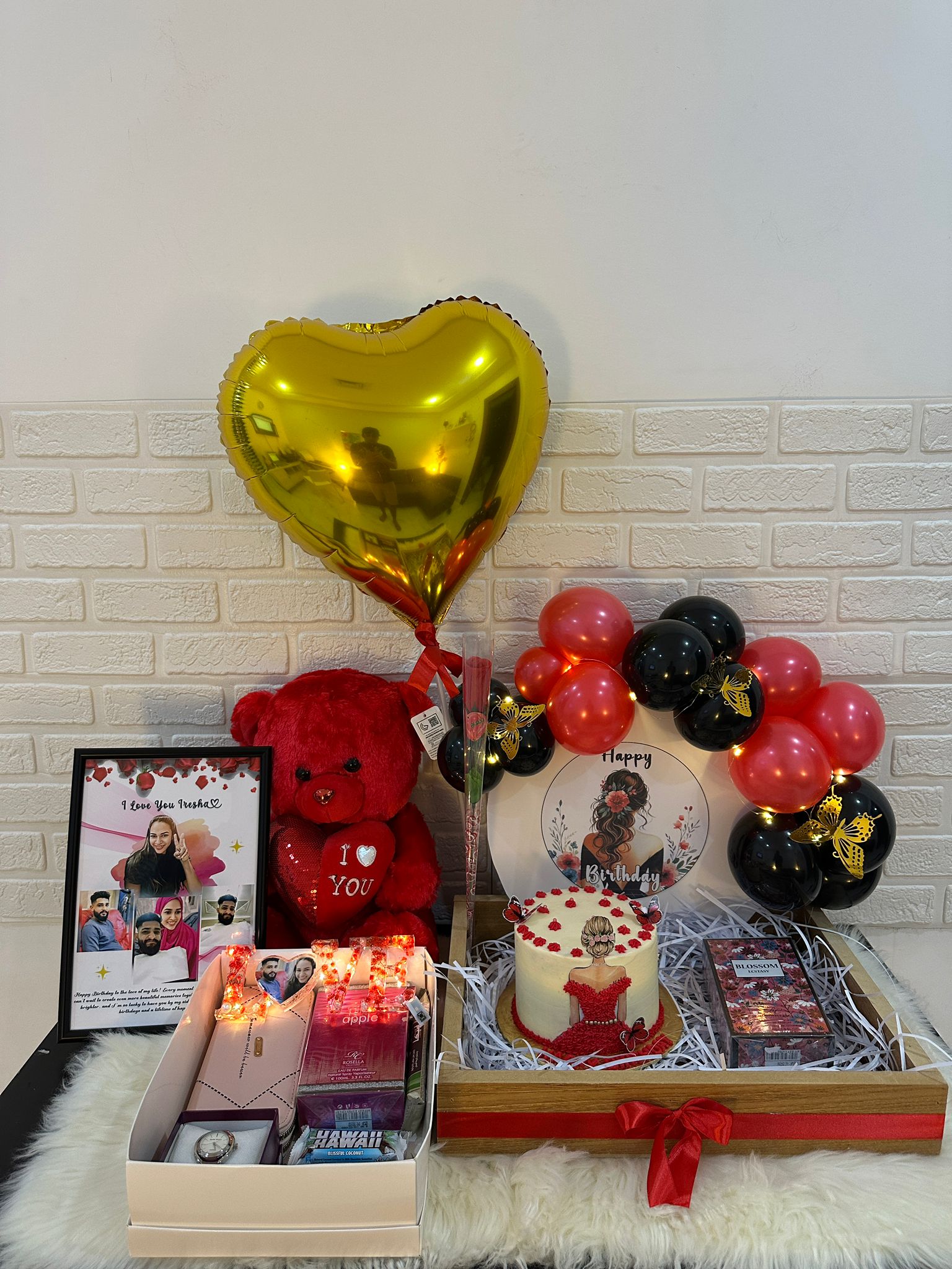 A beautifully arranged balloon hamper featuring premium balloons, soft lights, a large photo frame, a customized butter icing cake, perfume, a medium teddy, a resin love frame, and a special gift box with wallet, watch, perfume, and chocolates. Perfect for gifting on birthdays, anniversaries, or any celebration.